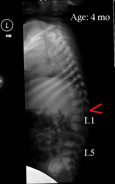 Check out the image of a newborn’s spine. This shows the difference between an adult spinal curve and newborn’s spinal curve. In the photo the peak of the spine is marked in red. The area marked “L1” is where the nerves for the intestines comes from. Those nerves pass through the dark spaces at the back of the square vertebra. In adults, the peak of the kyphosis (the primary curve, think of what “fetal position” looks like) is between the shoulders. In infants who haven’t started pushing up to crawl, bringing the pelvis up into flexion (as is done during a traditional diaper change) straightens the lumbar curve, then the spine bends at this axis. As the lumbar curve becomes more established with crawling, this kyphotic peak moves up the spine into the area of the true rib cage and no longer causes posterior migration of moveable segments during pelvic flexion. You can see now why a subluxation in this area might cause such a problem.